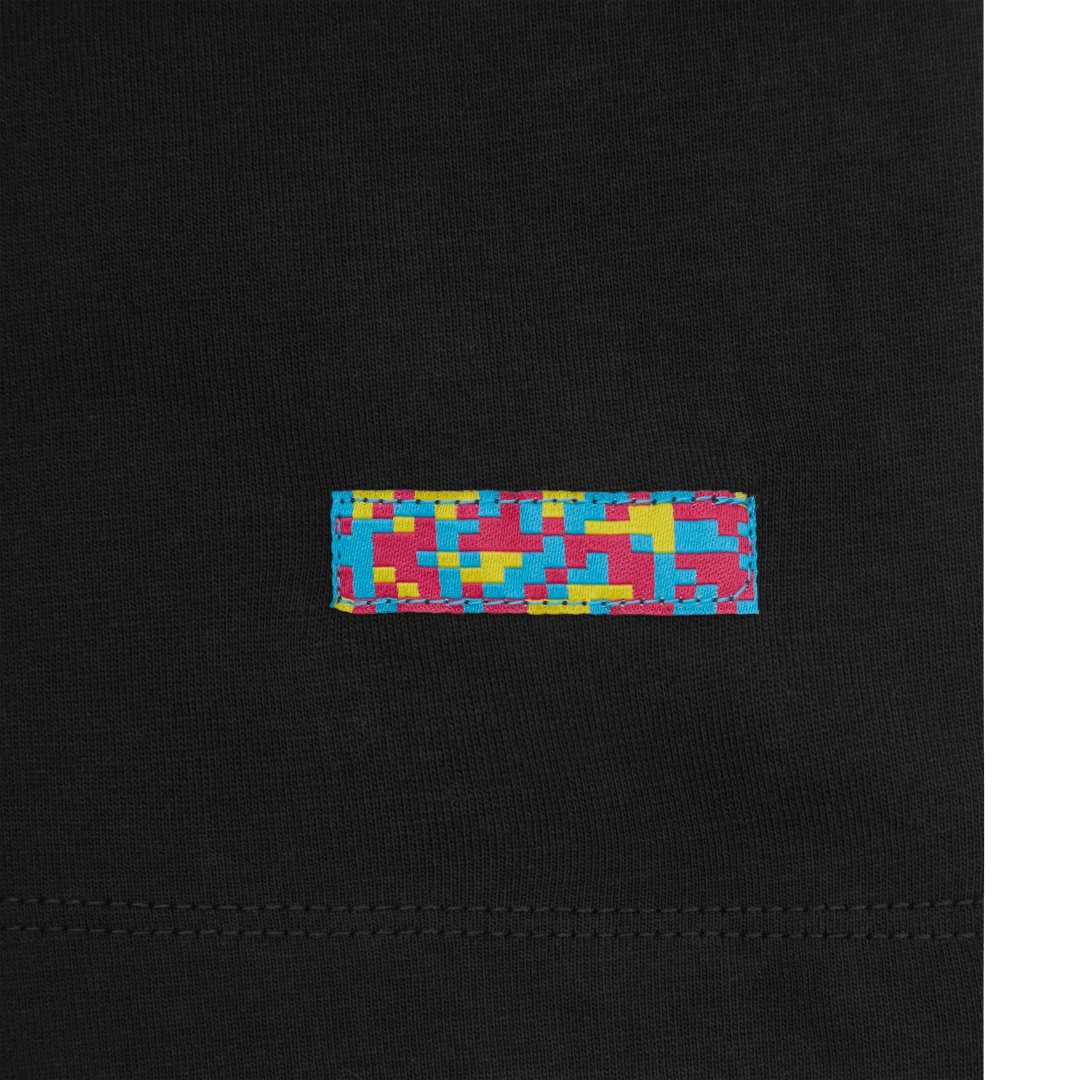 Neon blue and pink angel screen print at front. Fan Ink screen print at top back. Fan Ink woven label at side. Fan Ink digital camo label at back hem. Made in Portugal.